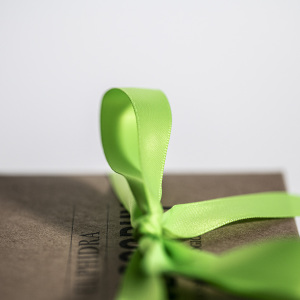 Cofanetti automontanti composti da fondo a petalo + coperchio stampati ad 1 colore pantone su cartoncino Kraft. Applicazione nastrino in doppio raso.